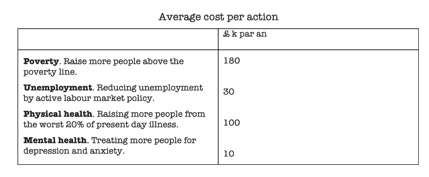 Increasing happiness is not only economically beneficent, but also more efficient: it is almost 20 times cheaper to treat people for mental health than to raise them above the poverty line.[12]
