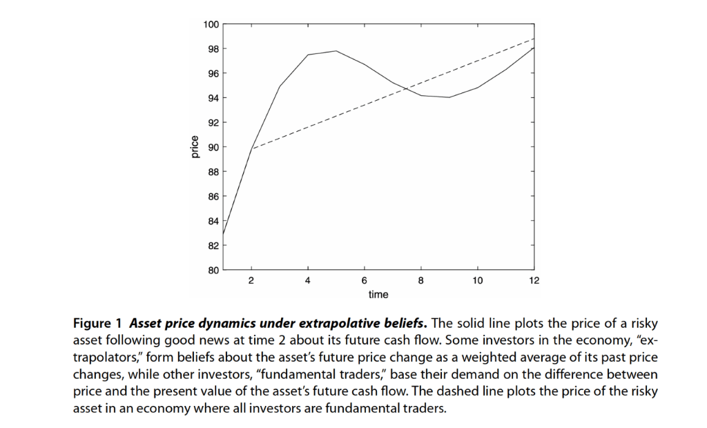 The simple model of extrapolation could amazingly account for the phenomenon. First, we should imagine an extrapolator who believes that the more recent news is the most important. Therefore, his expected future price change is a weighted average of the past price changes that puts more weights on the more recent changes (Barberis, 2018). Now we are all set.