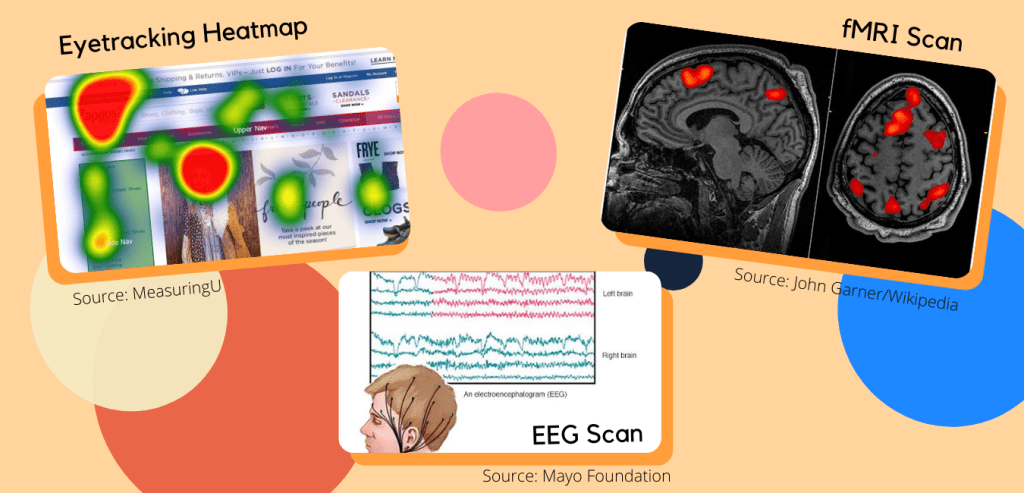 We then move on to the second stage of research where we study how successful we were in eliciting the desired emotions. The easiest – and cheapest – way to do so is through eye tracking. If you want to test the efficiency of a landing page or graphics for an advertisement, you need to insert a picture of the following into a software and then choose a relevant sample size to show the image to. If you find that you were not successful in getting people to look at what you intended to draw their attention to, then you know that something needs to be changed. Although eye tracking can tell you whether people did see what you wanted them to, it can’t tell you anything about the emotions people felt when looking at the image.